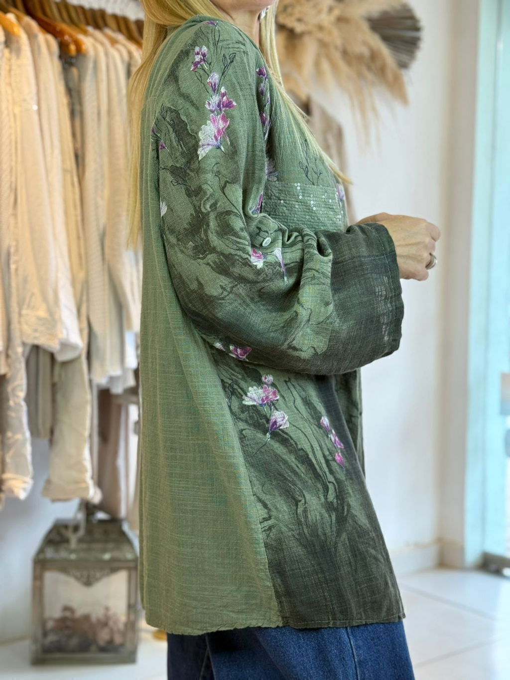 🌸Con flores pintadas, detalles en paillette, corte amplio y mangas arremangables